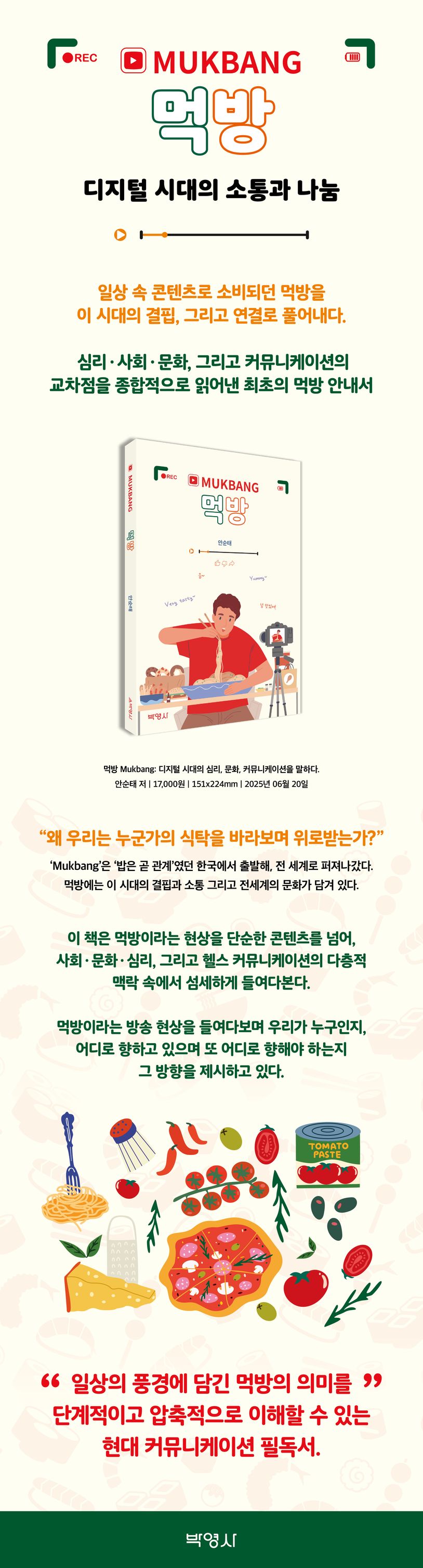 우리는 왜 먹방을 보며, 그 감정을 공유하며 이야기를 나누고 싶어하는가? 이 책은 그러한 질문에서 출발한다. 먹방의 탄생과 진화, 그 안에 숨겨진 심리적·사회적 의미를 탐구하며, 한국에서 시작된 먹방이 영문 Mukbang으로 널리 퍼진 과정과 배경을 살펴보고자 한다. 또한 ‘밥심’, ‘밥상머리’ 등 밥과 관련된 한국 문화가 공동체 형성과 정서적 유대에 어떤 역할을 해왔는지, 디지털 미디어 속에서 먹방을 통해 어떻게 재현되고 있는지 이야기하고자 한다.