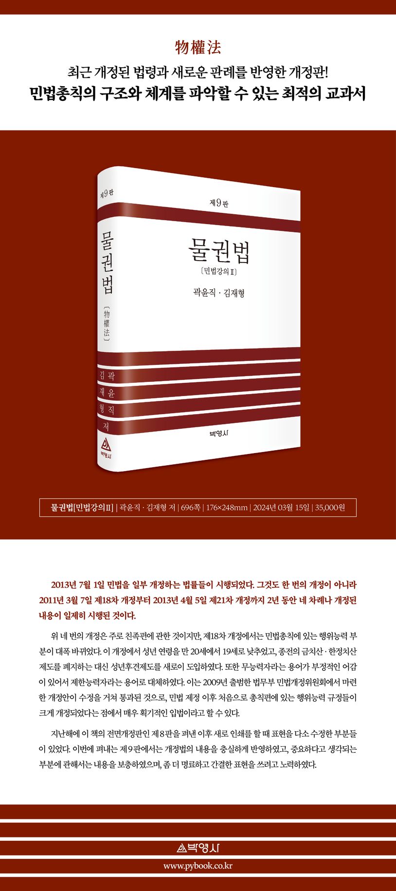 2014년물권법제8판(전면개정)을펴내고2015년에는최소한의수정을해서그보정판을펴냈다.이개정판에서는그후에나온판례를충실하게소개하고법령개정을반영하였으며교과서의내용을좀더명확하게서술하는데중점을두었다.지난10년동안물권법에관한논의가활발해지고새로운판례도많이나왔다.공유물의보존행위에관한판례는대법원전원합의체판결로변경되었다.배타적사용.수익권의포기,관습상법정지상권,분묘기지권의취득시효,부동산명의신탁과불법원인급여,그리고공동근저당권에관하여대법원전원합의체판결이선고되었다.자기소유부동산에관한취득시효,채권담보목적의전세권,공동저당,누적적근저당권,동산담보권등에관해서도중요한판례가나왔다.필자는2016년9월부터6년동안대법관으로서위와같은판결중상당수에참여하였다.이러한경험도이개정판에반영되어있다.이개정판은표현을간결하게하고자했는데도새로운판례를반영하느라종전판에비하여30면가량늘어났다.이책이물권법을이해하고학습하는데조금이나마도움이되기를바란다.2024년2월김 재 형