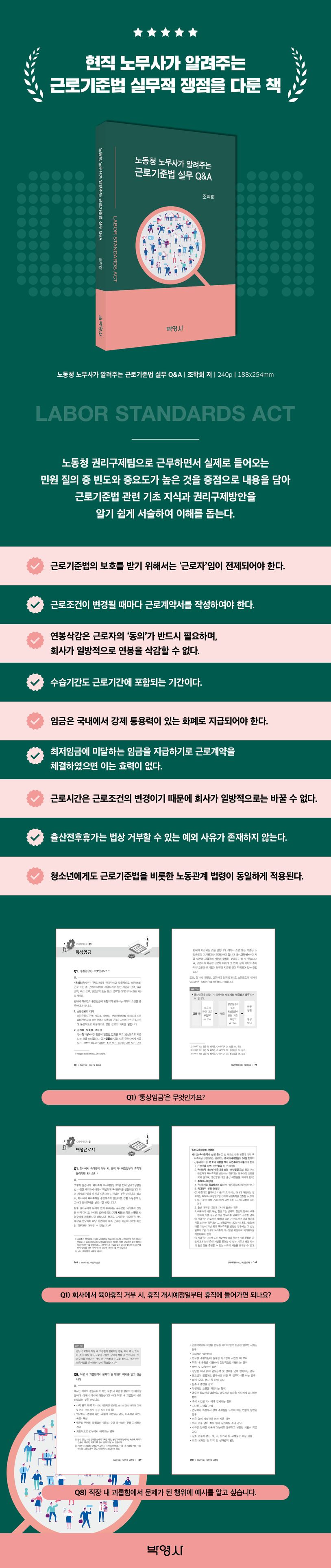 노동청 권리구제팀으로 실제로 들어오는 민원 질의 중 빈도와 중요도가 높은 순으로 선별하였다. 민원실에서 상담하는 내용을 담고자 하여 노동위원회에서 진행되는 부당해고 등과 고용센터의 지원금 업무는 상세히 담지 않았다. 사회 초년생을 비롯한 근로자는 근로기준법 관련 기초 지식과 권리구제방안을 쉽게 이해할 수 있을 것이다. 또한, 노무사 진로를 고민하시는 분, 수습 노무사, 사업경영자, 인사노무 담당자 및 예비 창업자는 근로기준법과 관련하여 어떤 사안들이 실무적 쟁점이 되고 있는지 직관적으로 파악하실 수 있다.