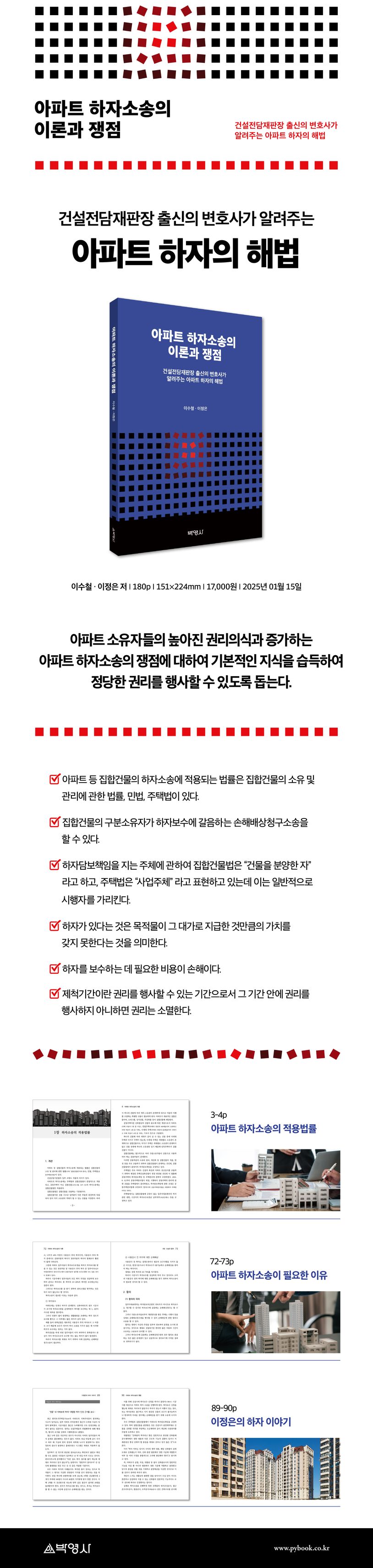 아파트 현장에서 입주민들의 고민을 접한 경험을 바탕으로 작성된 책이다. 입주민들이 많이 하는 질문, 소송을 하면서 주의하여야 하는 부분, 소송에서 첨예하게 다투는 구체적인 하자 사례 등. 한국아파트신문에 2023년과 2024년, 약 1년간 23가지의 주제를 가지고 컬럼을 쓴 내용과 인터뷰를 엮었다.