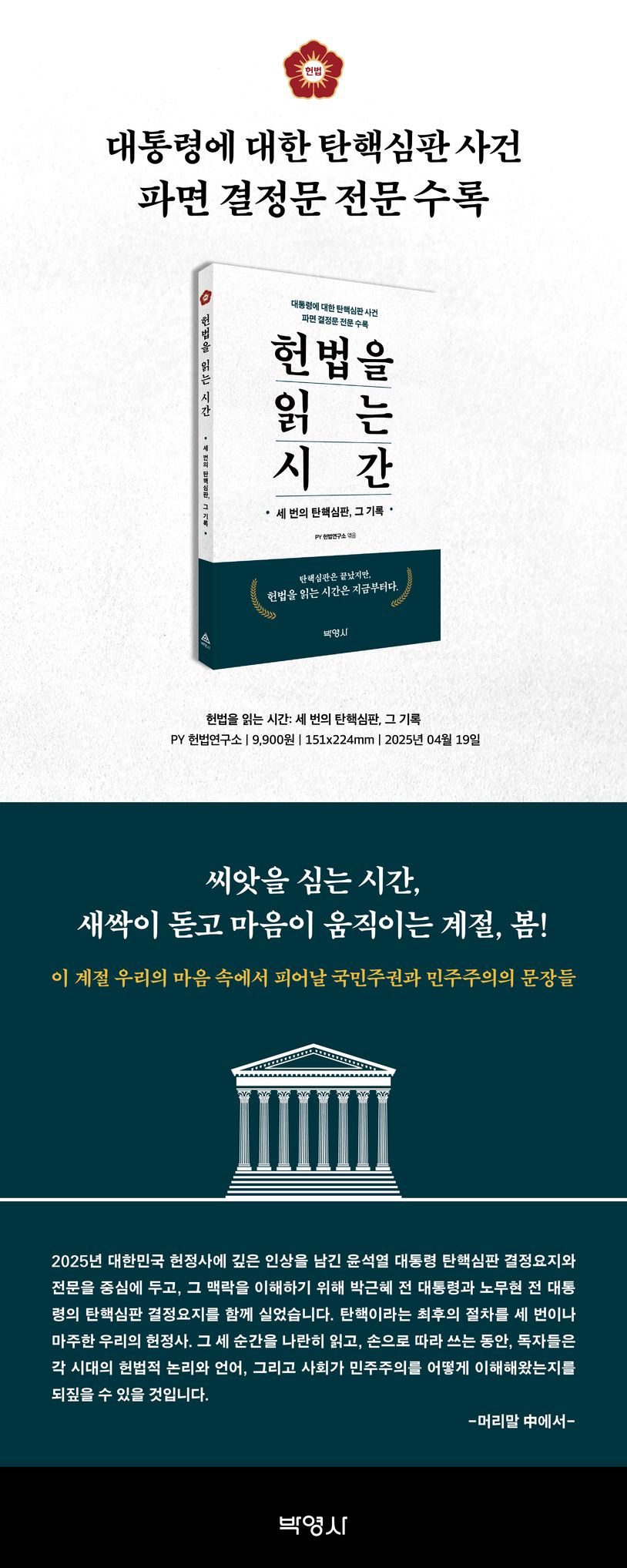 “헌법을 읽는 시간”은 이러한 질문에서 시작된 책입니다. 이 책은 단지 필사하기 좋은 문장을 골라 모아놓은 책이 아닙니다. 2025년 대한민국 헌정사에 깊은 인상을 남긴 윤석열 대통령 탄핵심판 결정요지와 전문을 중심에 두고, 그 맥락을 이해하기 위해 박근혜 전 대통령과 노무현 전 대통령의 탄핵심판 결정요지를 함께 실었습니다. 탄핵이라는 최후의 절차를 세 번이나 마주한 우리의 헌정사. 그 세 번의 순간을 나란히 읽고, 손으로 따라 쓰는 동안 독자들을 각 시대의 헌법적 논리와 언어, 그리고 우리 사회가 민주주의를 어떻게 이해해왔는지를 되짚을 수 있을 것입니다.
