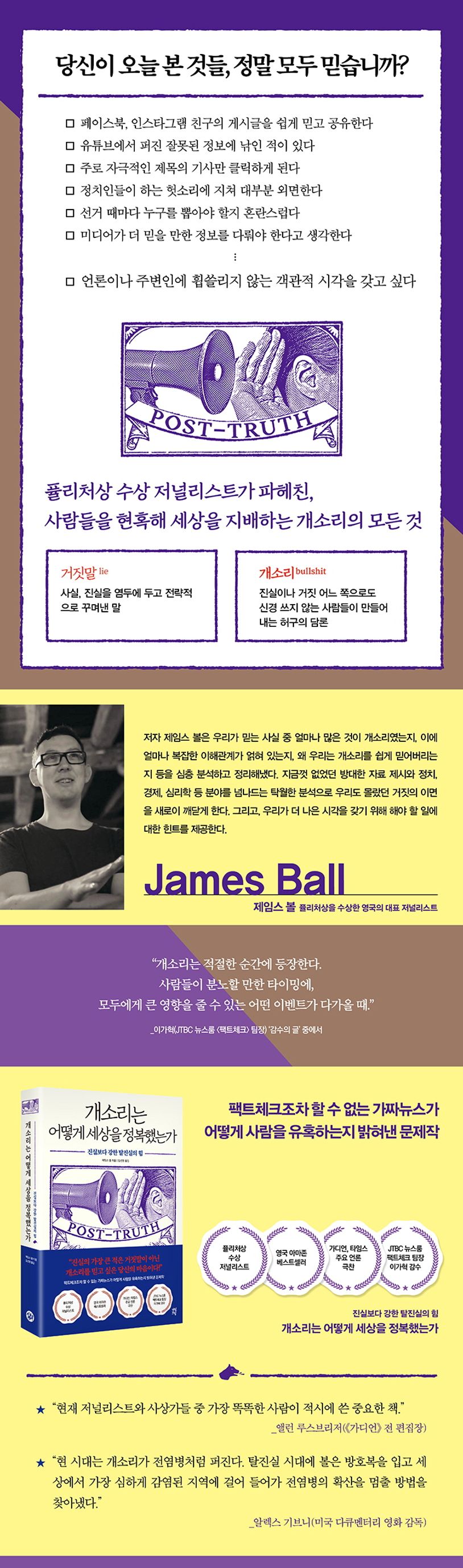 퓰리처상 수상 저널리스트가 파헤친, 사람들을 현혹해 세상을 지배하는 개소리(bullshit)의 모든 것. 가짜뉴스가 세상을 휩쓸고 탈진실 시대가 도래하자 새로운 복병이 나타났다. 바로 개소리다. ‘에드워드 스노든 폭로 사건’ 보도 등으로 퓰리처상을 수상한 영국의 기자 제임스 볼은 거짓말보다 강력한 개소리에 대해 심층 분석하고 정리해냈다. 거짓말은 진실과 권위를 염두에 두고 전략적으로 행하는 것이라면, 개소리는 진실도 거짓도 신경 쓰지 않고 마구 내뱉는 허구의 담론이다. 중요한 건 개소리가 사람들의 일상, 주요 국가 정책, 지도자 선정에 이르기까지 삶의 모든 중요한 영역을 파고든다는 점이다.