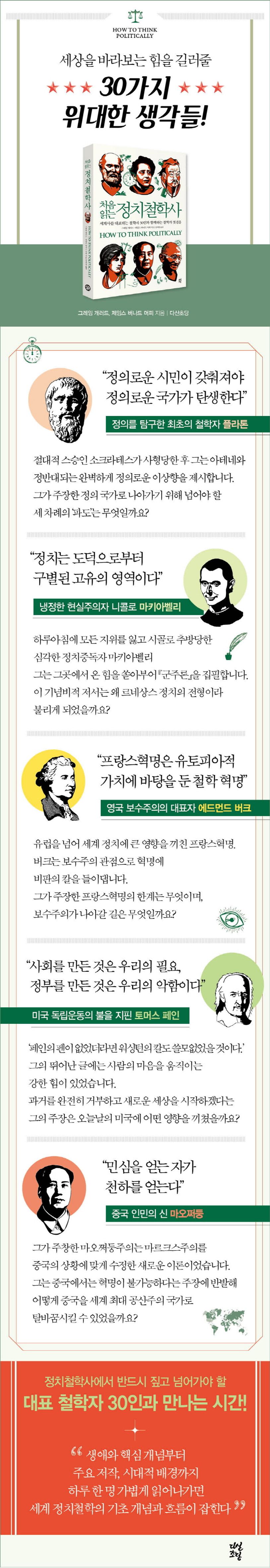 기원전부터 21세기에 이르기까지 방대한 정치철학사를 총 30인의 이야기를 통해 단순하고 명쾌하게 풀어냈다. 오늘날의 정치를 이해하려면 현 정치 체제의 기초를 세운 인물들을 이해해야 한다. 세계사를 좌우한 정치 이념을 구축해온 인물들의 삶과 세계관을 추적하면, 그들의 정치적 사고가 시대 속에서 어떻게 탄생하고 진화하여 실현되었는지, 그 생성과 흐름을 자연스럽게 살펴볼 수 있다.