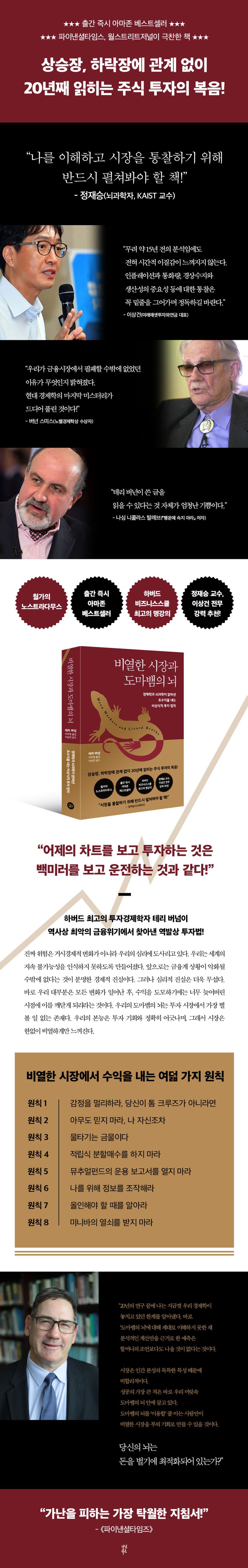 하버드케네디스쿨, 비즈니스스쿨 등 하버드대학교에서 경제학 교수를 역임하며 ‘당대 최고의 투자경제학자’라고 불린 테리 버넘이 유일하게 펴낸 투자서 『비열한 시장과 도마뱀의 뇌』가 2023년 전면 개정판으로 돌아왔다. 번역의 퀄리티를 높임은 물론, 투자 지식을 전하는 데 자타공인 대한민국 최고의 전문가인 미래에셋투자와연금 이상건 대표의 꼼꼼한 감수를 더해 책의 완성도를 높였다. 또한 저자의 2023년 한국어판 서문까지 더해 혼돈의 주식시장에서 불안해하는 투자자들에게 가장 최적화된 정보를 담아냈다.