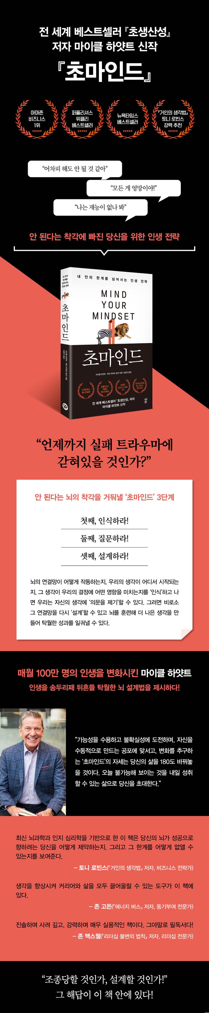 대중 가까이에서 호흡하며 리더십, 생산성, 목표 설정에 관한 노하우를 제시하고 있는 뛰어난 멘토이자 전 세계적 베스트셀러인 『초생산성』의 저자인 마이클 하얏트의 신작. 만만치 않은 인생에서 우리는 ‘어차피 해도 안 될 거야’와 같은 부정적인 생각에 사로잡히곤 한다. 이때 우리에게 필요한 건 지금 하고 있는 생각을 바꿔볼 용기다. 이 책 『초마인드』에서는 안 된다는 착각에서 벗어나 성공을 맛볼 수 있는 뇌 설계법을 소개한다.