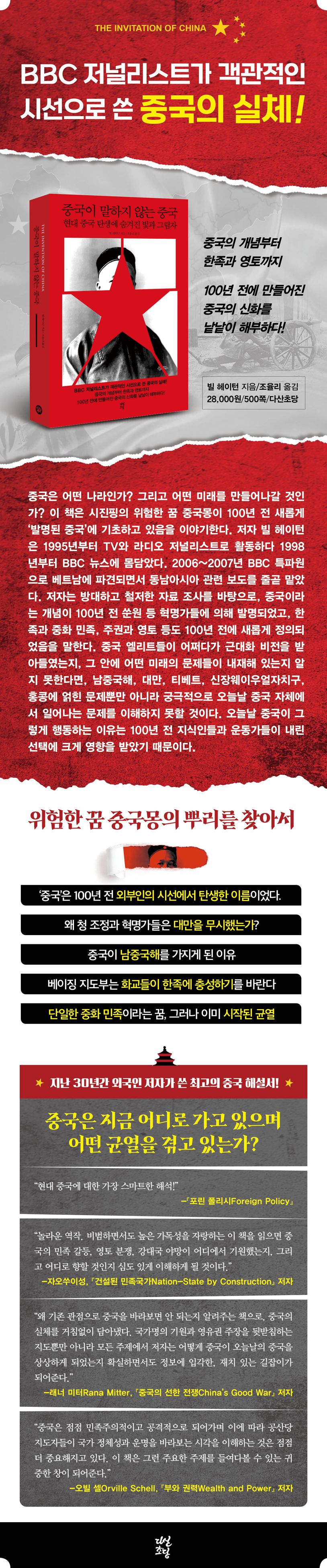 중국은 어떤 나라인가? 그리고 어떤 미래를 만들어나갈 것인가? 이 책은 시진핑의 위험한 꿈 중국몽이 100년 전 새롭게 ‘발명된 중국’에 기초하고 있음을 이야기한다. 저자 빌 헤이턴은 1995년부터 TV와 라디오 저널리스트로 활동하다 1998년부터 BBC 뉴스에 몸담았다. 2006~2007년 BBC 특파원으로 베트남에 파견되면서 동남아시아 관련 보도를 줄곧 맡았다. 저자는 방대하고 철저한 자료 조사를 바탕으로, 중국이라는 개념이 100년 전 쑨원 등 혁명가들에 의해 발명되었고, 한족과 중화 민족, 주권과 영토 등도 100년 전에 새롭게 정의되었음을 말한다. 이러한 중국의 민족주의는 현재 국수주의와 패권주의로 변화하고 있다.