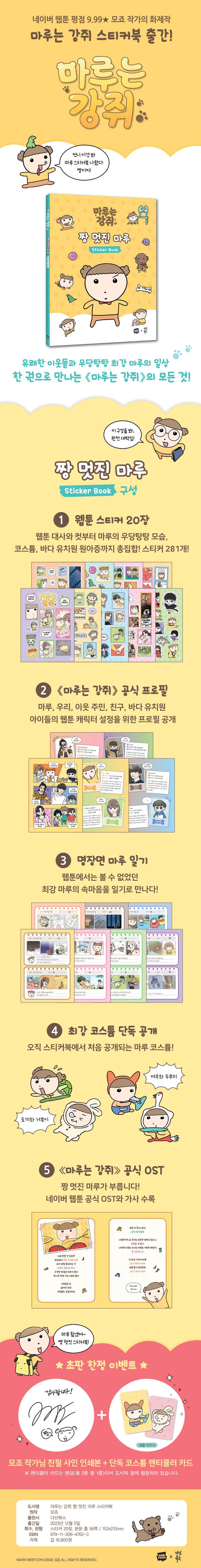 네이버 웹툰 연재 평점 99.9★, 팝업스토어 방문객 12만 명이라는 대기록을 세운 모죠 작가의 화제작! 세상 모든 언니들의 마음을 사로잡은 웹툰 〈마루는 강쥐〉의 우당탕탕 일상과 귀여움을 가득 담은 스티커북입니다. 웹툰 속 마루와 등장인물 모습은 물론, 명대사, 다양한 코스튬, 애착 장난감, 원아증까지 스티커 20장에 가득 담았습니다. 다이어리, 케이스, 노트북 등 나의 일상이 닿는 곳을 〈마루는 강쥐〉 스티커로 마음껏 꾸며 보세요. 웹툰에서는 공개된 적 없는 마루의 특별한 모습과 이야기도 만날 수 있습니다.