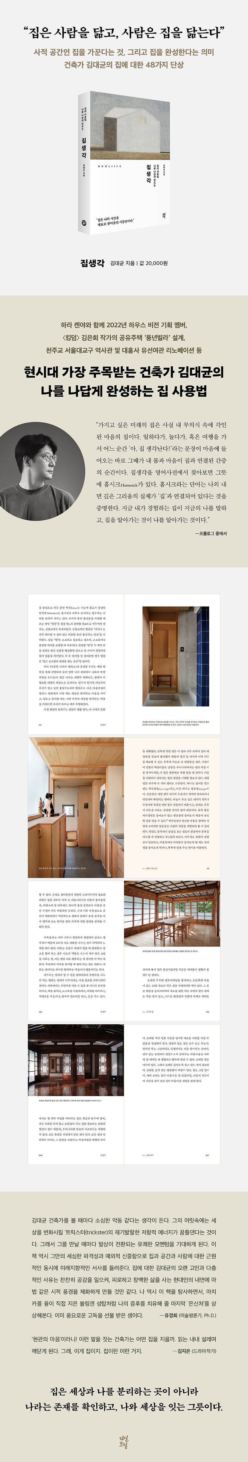 착착스튜디오를 운영하며 〈킹덤〉의 작가 김은희 작가의 ‘풍년빌라’를 건축하고, 천주교 서울대교구 역사관과 대흥사 유선여관의 리노베잉션을 맞는 등 다양한 공간을 연출, 설계하며 여러 프로젝트를 성공으로 이끈 건축가 김대균 소장은 이 책에서 집에 대한 다양한 단상을 살피고, 지금껏 당연하게만 여겼던 집이라는 공간이 정말로 무엇인지, 또 우리에게 어떤 역할을 하는지에 대해 인문학적 시선으로 풀어낸다.