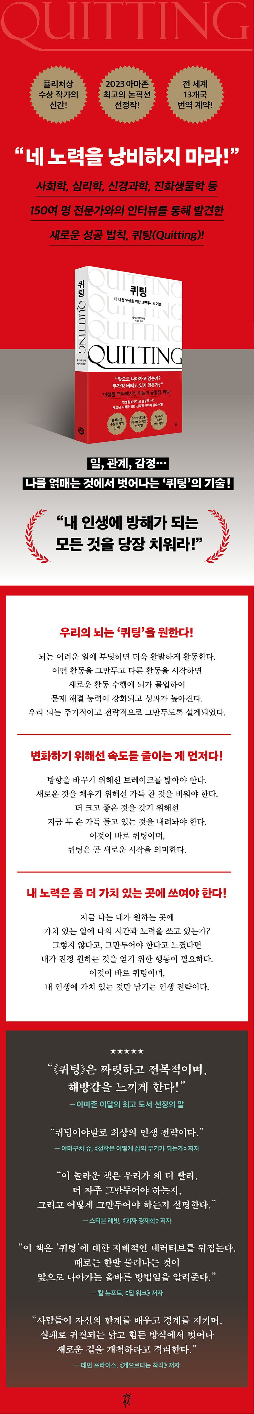책은 저자의 이야기로 시작된다. 대학원생으로 조교 생활을 하던 저자는 혼자 살던 집 방바닥에 주저앉아 눈물에 젖은 수건을 들고 집으로 전화해 그만두고 싶다고 이야기했다. 이후로 저자에게는 몇 번의 퀴팅을 더 경험했다. 그리고 그때마다 인생은 조금씩 확장되었다. 하지만 여전히 처음 그만두었을 때의 두려움을 생생히 기억하고 있음을 떠올리며, 왜 우리는 그만두는 것에 공포를 느끼는지를 조사하기 시작했다. 퓰리쳐상 수상 작가답게 150여 명에 달하는 신경과학자, 진화생물학자, 심리학자 등의 전문가와 퀴팅을 통해 적극적으로 인생을 바꾼 사람들에게 이야기를 들으며, ‘퀴팅’에 대한 잘못된 인식이 어떻게 개인과 사회의 가능성을 제한하는지를 파헤쳤다. 그리고 그 과정을 담아낸 한 권의 책은 2023년 아마존 최고의 논픽션 작품 중 하나로 선정되는 등 큰 반향을 불러일으켰다.