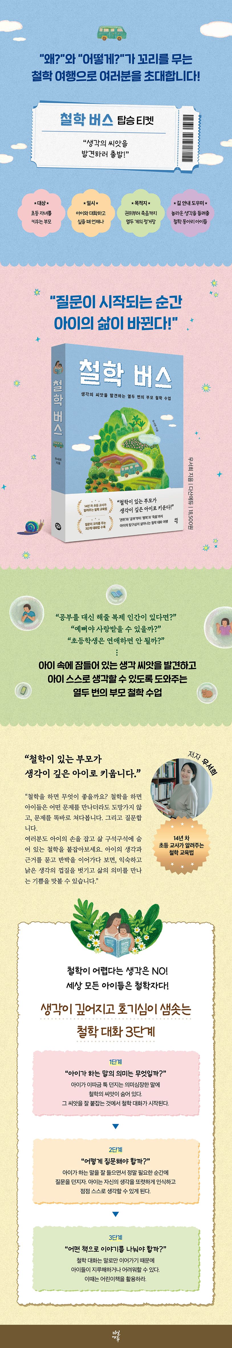 이 책은 철학을 통해 아이에게 생각하는 힘을 키워주고 싶은 부모를 위한 안내서이다. ‘공부’ ‘외모’ ‘우정’ 등 아이의 일상에 맞닿아 있는 키워드부터 ‘자유’ ‘행복’ ‘죽음’ 등 평소에 마주할 기회가 없는 철학 키워드까지 다양한 주제를 정거장 삼아 열두 번의 철학 여행을 안내한다. 왜 철학이 중요한지, 아이와 어떻게 대화를 나눠야 하는지 구체적인 방법을 담은 것은 물론, 부모가 아이의 깊은 마음을 발견할 수 있도록 제대로 듣고, 올바른 질문을 던지고, 생각을 이끌어내는 과정을 단계별로 설명한다. 아이들의 진짜 목소리를 듣고 함께 생각을 나누는 기쁨을 얻고 싶은 부모들을 위한 즐겁고 유쾌한 길잡이가 될 것이다.