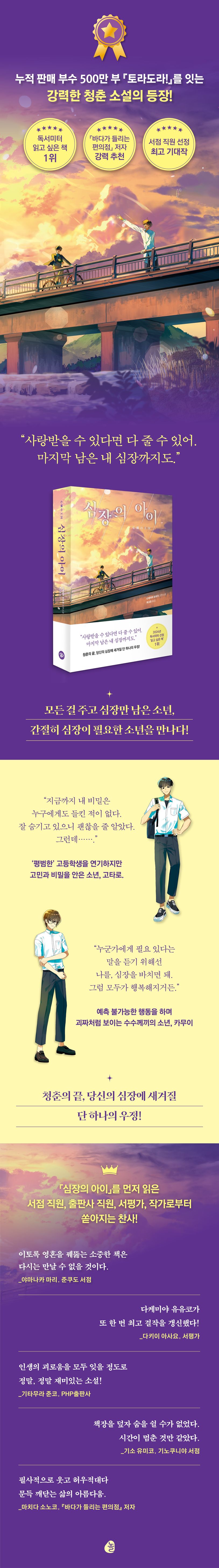누적 판매 부수 500만 부의 기록을 세우며 애니메이션으로도 제작돼 ‘청춘 러브 코미디’라는 장르를 새롭게 정립한 『토라도라!』의 저자 다케미야 유유코가 빛나는 청춘의 우정을 다룬 최신작 『심장의 아이』로 국내 독자들을 만난다. 모든 걸 다 내어주고 오직 심장만 남은 소년과 간절히 심장이 필요한 소년이 우연히 마주치며 펼쳐지는 이야기를 담은 이 소설은, 반짝이는 청춘 속에서 겪는 두 주인공의 불안과 외로움을 섬세하게 그려내면서도 예측할 수 없는 반전으로 독자를 이끈다.