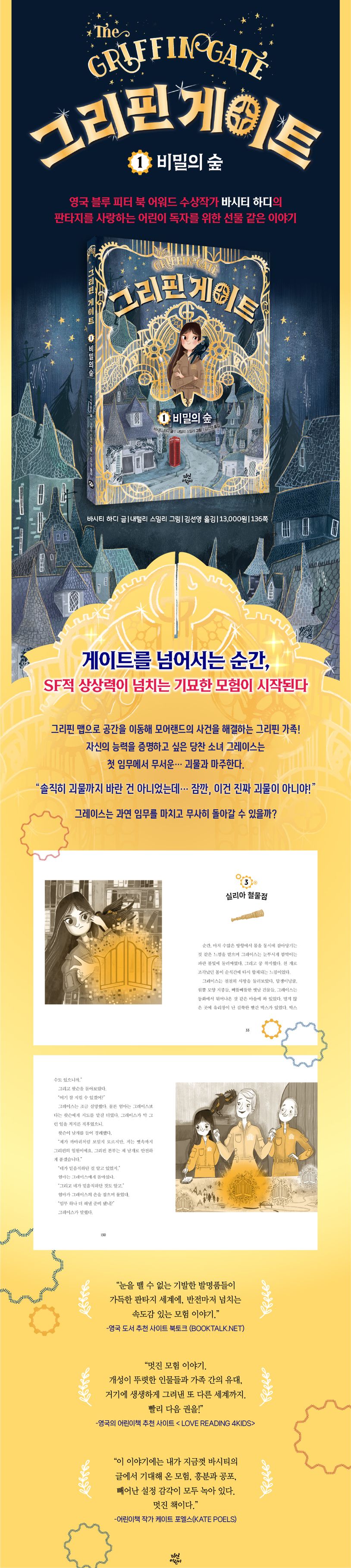 순간 이동 기술을 이용해 그들이 사는 모어랜드의 모든 곳에서 일어나는 사건과 사고를 해결하는 그리핀 가족의 첫 번째 이야기! 그리핀 가족은 지도의 게이트 너머에서 위험과 맞서 싸우는 수호자이다. 하지만 그레이스 혼자 수호자로 임무를 수행하려면 2년이나 더 기다려야 한다. 자신의 능력을 증명하고 싶은 당찬 소녀 그레이스는 호출을 받고 반짝이는 게이트를 넘어서고, 비밀이 가득한 숲으로 향한다. 첫 임무에서 크고 무서운… 괴물과 마주한 그레이스! “솔직히 괴물까지 바란 건 아니었는데… 잠깐, 이건 진짜 괴물이 아니야!” 예상치 못한 위기에 처한 그레이스의 기묘한 모험. 과연 그레이스는 임무를 마치고 무사히 돌아갈 수 있을까?