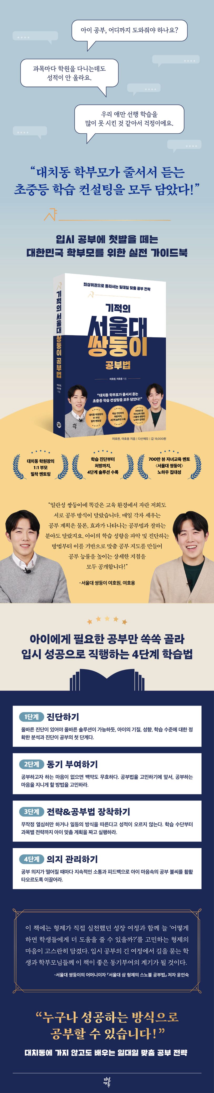 아이의 학습 성향을 파악 및 진단하는 방법부터 이를 기반으로 내 아이에게 맞춘 중장기 공부 지도를 만들어 공부 능률을 높이는 상세한 지침을 이 책에 담았다. 더불어 대치동 학부모들에게 자주 듣는 학습법 질문들에 대한 서울대 쌍둥이만의 모든 노하우를 안내한다.