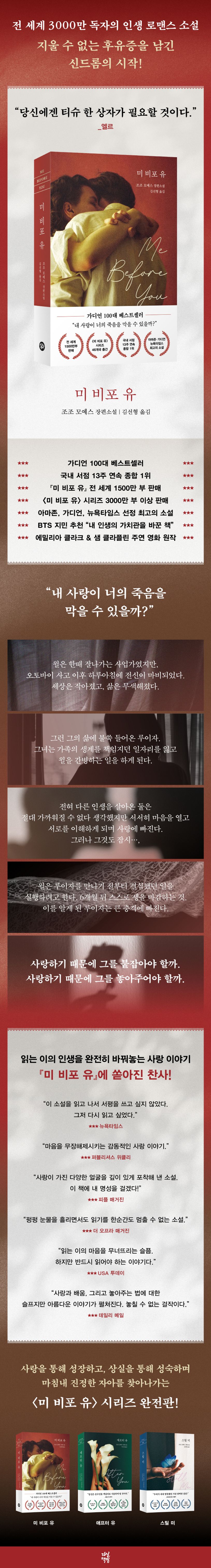 시작은 2013년 영국이었다. 『미 비포 유』는 입소문만으로 베스트셀러가 되었고, 독서 클럽과 SNS, 언론에서 이 책을 주제로 토론을 벌이는 등 화제를 모았다. 이후 출간된 독일에서는 엄청난 판매량을 기록하며 아마존 1위를 차지했다. 스웨덴에서는 마들렌 공주가 신혼여행에서 읽은 책으로 유명해졌다. 국내에는 2014년 1월에 출간되었는데 처음 소개되는 작가의 책임에도 불구하고 출간된 해에 바로 종합 베스트셀러 1위에 올랐다. 신간 소설로는 그해 들어 처음 획득한 타이틀이었다. 단 4개월 동안 누적 판매 6만 부를 돌파했고, 1위의 자리를 12주 연속 유지했다. 꼭 영화로 보고 싶다던 독자들의 바람도 이루어져 동명의 제목으로 개봉한 영화도 흥행에 성공했다. (국내 개봉 당시 약 100만 관객을 동원했다.) 가벼운 로맨스 소설이 아닌, 로맨스의 공식을 배반하고 묵직한 삶에 대한 성찰을 주는 드문 작품의 등장에 독자들이 반응했던 것이다.