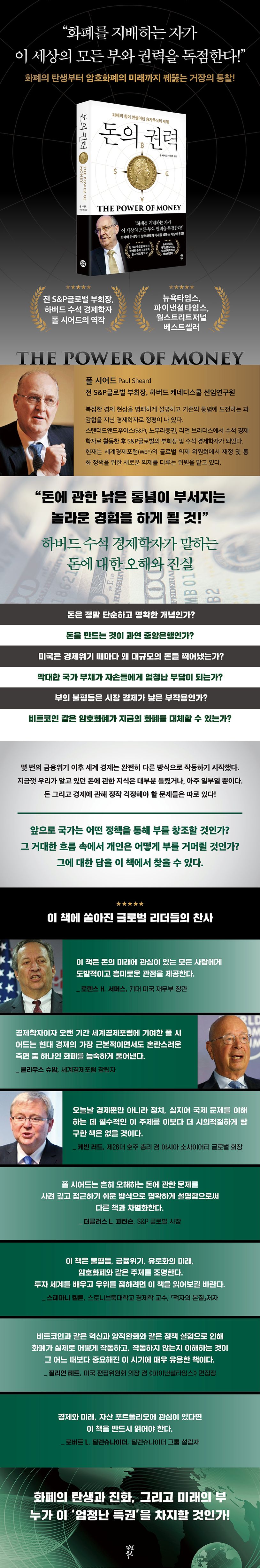 몇 번의 경제위기를 겪은 이후 세계 경제 시스템은 다른 방식으로 작동하기 시작했다. 돈을 찍어내고, 시중에 돈을 풀며 경기를 부양하기 시작한 것이다. 세계 금융시장을 움직이는 3대 신용평가기관 중 하나인 S&P글로벌의 부회장을 지낸 경제 전문가이자 하버드 수석 경제학자 폴 시어드는 이러한 경제 시스템의 작동 방식을 토대로 ‘돈에 대한 모든 것’을 설명한다. 돈의 탄생부터 국가의 발전에 따라 돈이 어떻게 진화해왔는지, 그리고 암호화폐의 부상으로 앞으로 화폐의 미래가 어떻게 변화할 것인지 등을 다루며 돈의 본질에 다가간다.