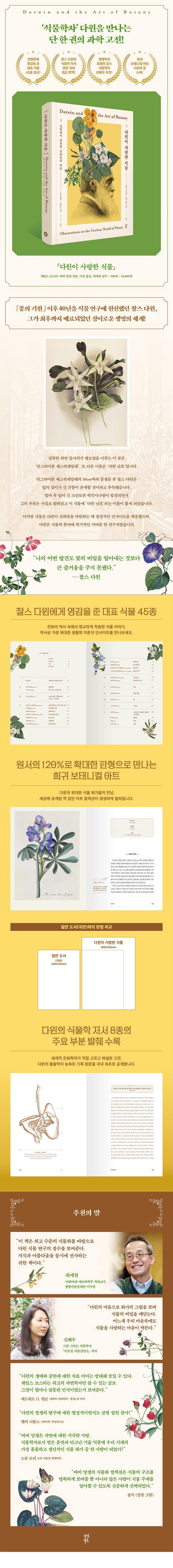 일례로 다윈은 안그라이쿰 세스퀴페달레의 30cm짜리 꿀샘을 보고 입의 길이가 긴 곤충이 존재할 것이라고 추측했다. 얼마 후 입이 긴 크산토판 박각시나방이 발견되면서 그의 추측은 사실로 밝혀졌고 이 식물에는 “다윈 난초”라는 별칭이 붙었다. 이처럼 식물학 분야에서 다윈의 획기적인 기여에도 불구하고 그의 식물학자적인 면모는 거의 주목받지 못했다. 이 책은 동물학자라는 이름에 가려졌던 식물학자로서 다윈의 면모를 재조명한다.