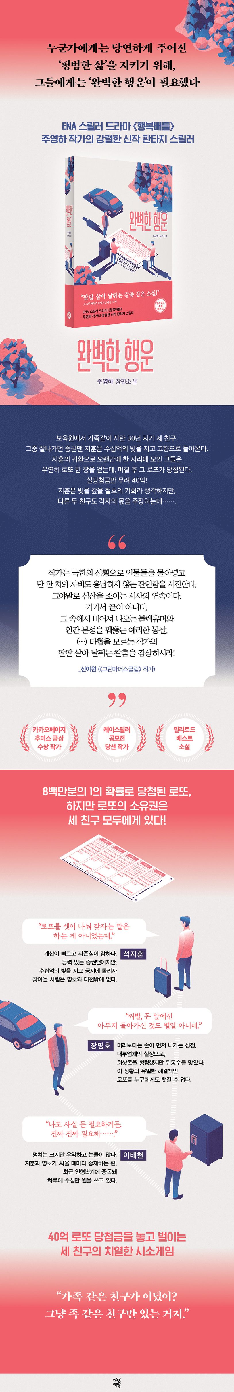 23년 드라마로 방영된 스릴러 『행복배틀』 , 생활밀착형 미스터리 『콩가루 수사단』, 타임슬립 로맨스 『시간의 계단』. 출간하는 작품마다 몰입도 높은 이야기로 주목을 받은 주영하 작가가 판타지 스릴러로 돌아왔다. 이번 신작 『완벽한 행운』은 40억 로또 당첨금을 놓고 세 친구가 벌이는 아귀다툼과 20년 전 비극에서 비롯된 불가해한 현상을 속도감 있게 엮어내, 강렬한 이야기를 기다린 독자들에게 서사적 쾌감을 선사한다.