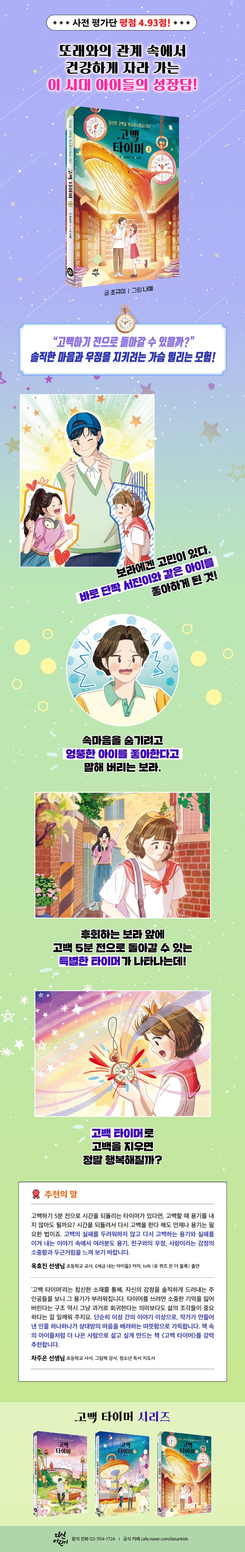 책과 보드게임을 즐기며 평온하게 지내던 보라에게 커다란 고민이 생겼다. 단짝 서진이와 같은 아이를 좋아하게 된 것이다. 서진이는 아무것도 모르고 있는데……. 그러다가 친구들이 모두 모인 여름밤 캠프 때 일이 벌어지고 말았다. 그저 속마음을 숨기려고 했을 뿐인데 엉뚱한 아이에게 고백을 해 버린 것. 이 일은 아이들 사이에 순식간에 퍼지고, 보라의 평범했던 일상은 엉망진창이 되어 버린다. 이때 보라 앞에 기억을 지우고 고백 5분 전으로 돌아갈 수 있는 특별한 타이머가 나타나는데! ‘고백 타이머’로 고백을 지우면 보라는 행복해질 수 있을까?