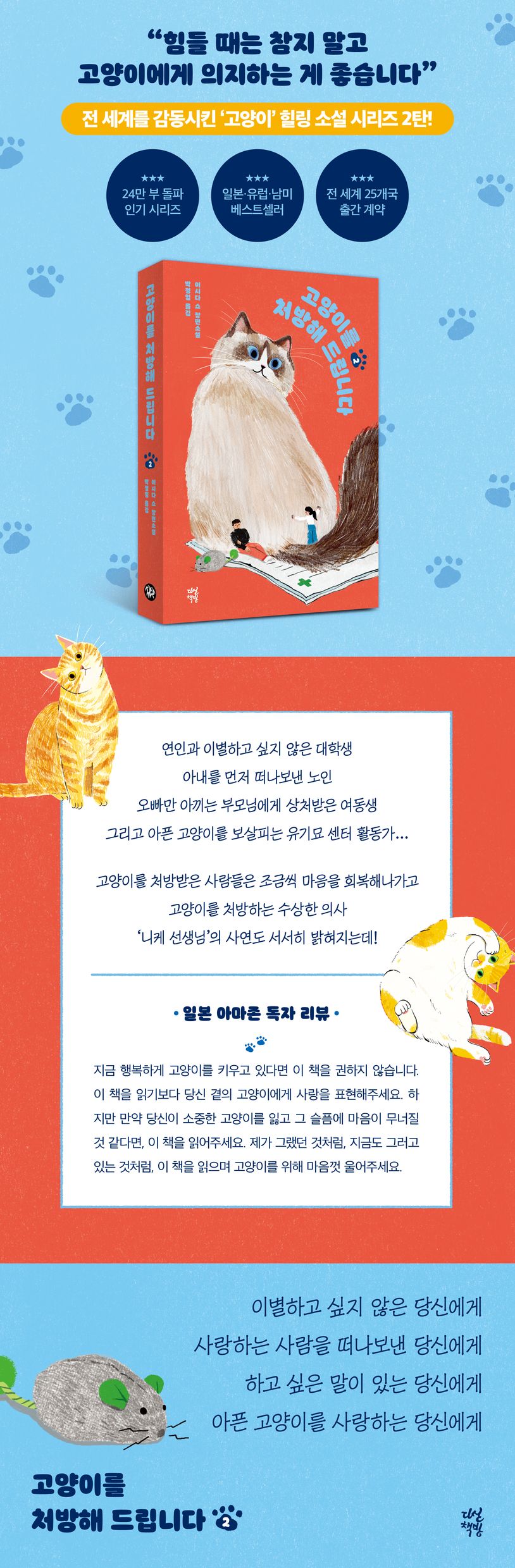 본격 ‘고양이’ 힐링 소설 『고양이를 처방해 드립니다』가 더 깊고 따뜻한 이야기로 돌아왔다. 2권에서는 1권의 감동을 이어받으며 고양이와 함께 상처받은 마음을 치유해가는 사람들의 이야기가 한층 더 풍성하고 다채롭게 펼쳐진다. 각기 다른 사연을 지닌 인물들이 때로는 엮이고, 때로는 스쳐가며 서로에게 미묘한 영향을 주는 모습은 이야기에 깊이를 더한다.