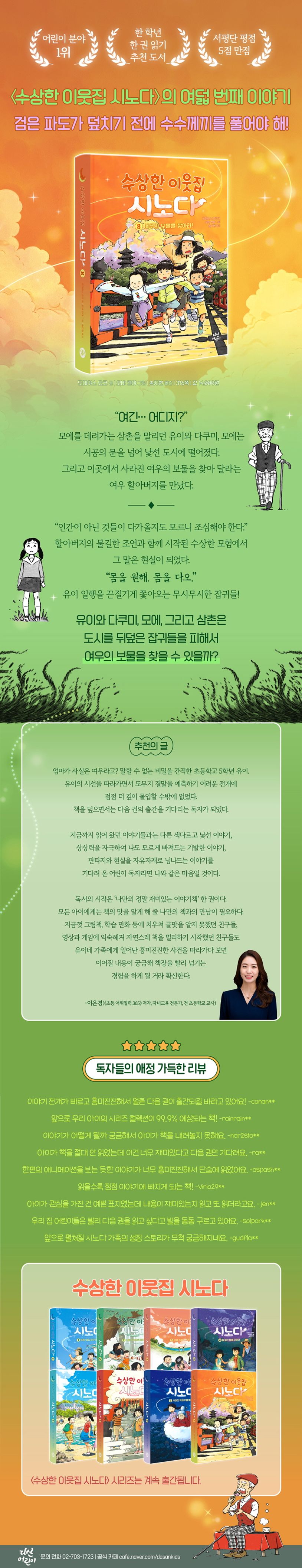 수상하지만 따듯한 이야기로, 많은 어린이 독자의 사랑을 받은 〈수상한 이웃집 시노다〉 시리즈는 출간하자마자 베스트셀러에 올랐다. 그 인기에 힘입어 8권에서는 여우의 보물을 찾다가, 무시무시한 잡귀들에게 쫓기는 유이 남매와 여우 삼촌의 이야기가 펼쳐진다. 유이 일행은 수수께끼를 풀고 신비한 여우의 보물을 찾을 수 있을까?