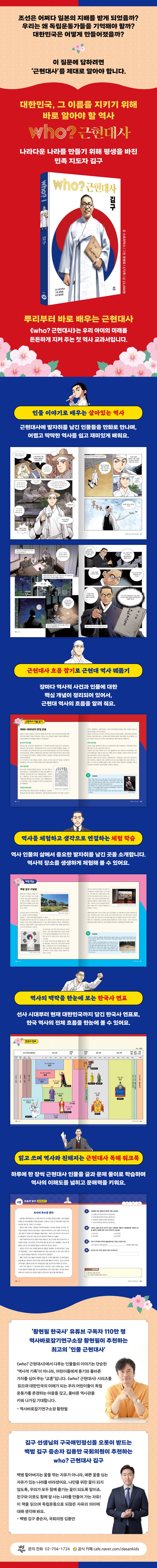 《who? 근현대사》는 시대를 관통하는 큰 흐름을 인물의 삶과 연결해 보여 줍니다. 이를 통해 독자들은 '나'와 '사회', '역사'를 유기적으로 연결하며, 자신을 민주시민으로서 인식하게 됩니다. 또한 우리 근현대사를 어린이들에게 쉽고 올바르게 전달할 수 있게 하여, 가정과 학교, 독서 교육 현장에서 다양하게 활용할 수 있습니다.