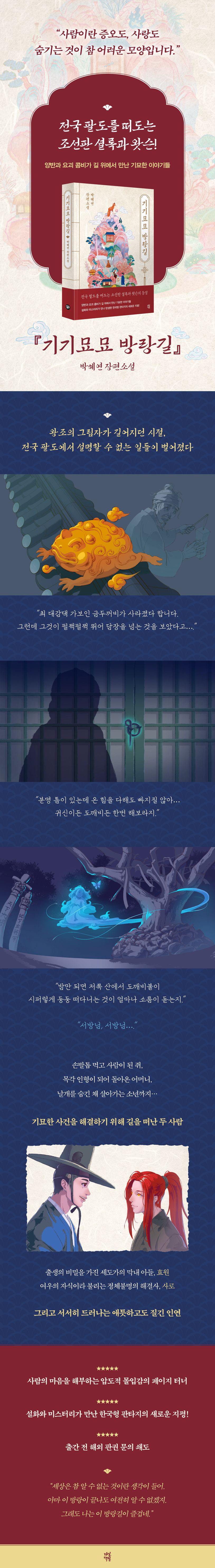 설화에서 길어 올린 기담들은 현대적인 문제의식과 감수성과 만나, 시대를 초월해 유효한 고민-상실, 죄책감, 외로움, 갈망, 차별 등의 주제를 환상적으로 풀어낸다. 기담이라는 외피를 두르고 있지만, 결국 이 소설은 자신을 받아들이고 타인을 이해하는 데까지 나아가는 따뜻한 성장 서사이기도 하다. 새롭고 강렬한 세계관과 깊은 여운을 남기는 두 인물의 관계성, 거기에 더해 장르적 재미까지 두루 갖춘 『기기묘묘 방랑길』은 우리가 지금까지 기다려온 진짜 한국형 판타지의 첫걸음이다.