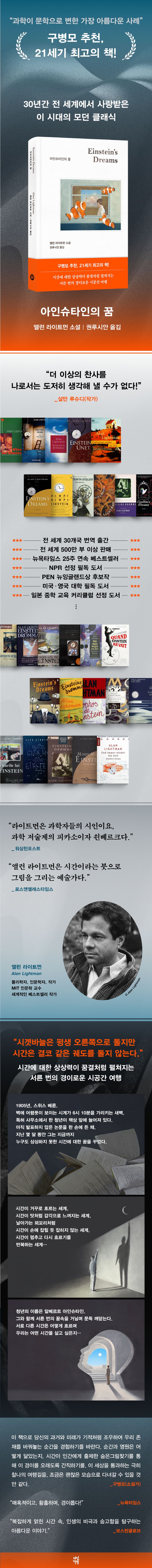 시공간을 초월한 서른 번의 꿈 이야기로 시간과 인간의 본질을 사색하게 만드는 앨런 라이트먼의 소설 데뷔작 『아인슈타인의 꿈』이 새 옷을 입고 다시 국내 독자들을 만난다. 라이트먼은 이론물리학을 전공하고 세계 최고의 공과대학으로 불리는 미국의 메사추세츠공과대학(MIT)에서 물리학 선임 강사로 근무하다, 현재는 인문학 교수로 재직하고 있다. MIT에서 최초로 과학과 인문학 분야에서 동시에 교수직을 맡은 그가 논리와 감성으로 빚어낸 데뷔 소설 『아인슈타인의 꿈』은 1993년에 출간되자마자 유수의 매체에 소개되었고, 뉴욕타임스에서는 25주 연속 베스트셀러에 올랐다. 세 번의 부커상을 수상한 작가 살만 루슈디는 이 소설을 두고 “더 이상의 찬사를 생각해 낼 수가 없다”고 극찬했다. 이 책은 전 세계 30개국에 번역 출간되어 500만 부 이상의 판매고를 올렸고, 미국과 영국의 대학에서는 필독 도서로, 일본에서는 중학 교육 커리큘럼으로 선정되었다. 출간된 지 30여 년이 지났지만 지금까지도 ‘모던 클래식’의 반열에 올라 그 문학적 가치를 인정받고 있다. 국내에서도 예외가 아니다. 구병모 작가는 ‘시간이 인간에게 출제한 숨은그림찾기를 통해 이 책으로 느낀 경이를 오래도록 간직하고 싶다’는 평을 남기며 21세기 최고의 책으로 『아인슈타인의 꿈』을 꼽았고, 윤고은 작가 또한 중학교 때 처음 이 소설을 읽은 후 15년 동안 시공간 여행을 멈추지 못하고 있다며 열렬한 애정을 고백한 바 있다.