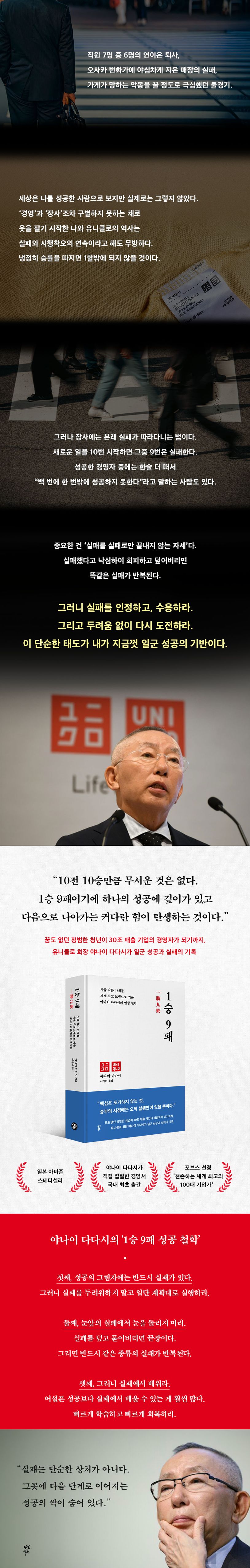 그러나 유니클로의 창업자인 야나이 다다시는 ‘지금까지 회사를 경영하며 셀 수 없을 만큼 많은 실패를 경험했다’라고 단호히 말한다. 실제로 그의 실패의 역사는 길고 화려하다. 미국에 새 브랜드를 선보였다가 싸늘한 대중의 반응을 마주하기도 했고, 영국에 냈던 21개의 매장 중 16개를 닫는 끔찍한 실패를 겪기도 했다. 아동복을 전문으로 하는 회사를 운영하다가 매장을 전부 폐쇄하기도 했으며, 오사카의 번화가에 처음으로 도심형 매장을 냈다가 장사에 실패하고 문을 닫은 적도 있다. 야나이 다다시는 「1승 9패」에서 이 모든 실패를 냉철한 시선으로 서술하고 평가한다. 무엇이 실패의 원인이었는지, 어떤 점이 개선되어야 하는지를 담담히 정리한 것이다.