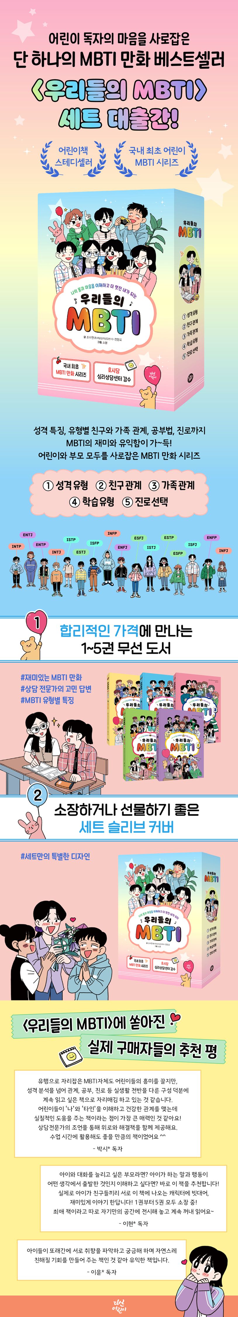 어린이 독자가 MBTI를 통해 성격을 이해할 수 있도록 풀어낸 『우리들의 MBTI』 시리즈 1~5권 무선 세트입니다. MBTI는 성격 유형마다 타고난 강점을 활용하고 단점을 보완하면서 성장할 수 있는 방향을 제시해 줍니다. 『우리들의 MBTI 1~5 세트』는 1권 ‘성격 유형’, 2권 ‘친구 관계’, 3권 ‘가족 관계’, 4권 ‘학습 유형’, 5권 ‘진로 선택’으로 구성되어 있습니다. 어린이 분야 최초! MBTI 성격 유형 만화 시리즈를 만나 보세요! 개성 가득한 MBTI 캐릭터들의 이야기를 만화로 즐기며, 권별 주제에 관한 궁금증과 고민을 해결할 수 있습니다.