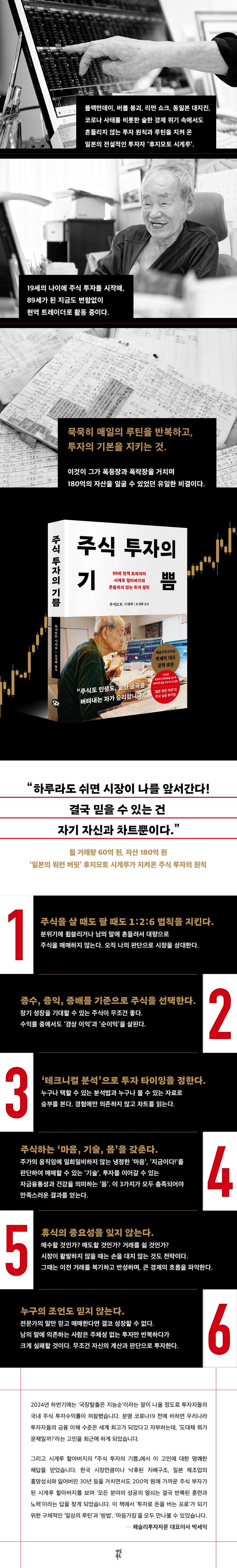자금의규모,거래비용,시장영향력,의사결정의일관성등개인투자자와기관투자자간의구조적인격차는명확하다.하지만후지모토시게루는70년간기관투자자에맞서며큰수익을올려왔다.그리고이러한행보를접한수많은개인투자자들이그의열렬한팬이되었다.