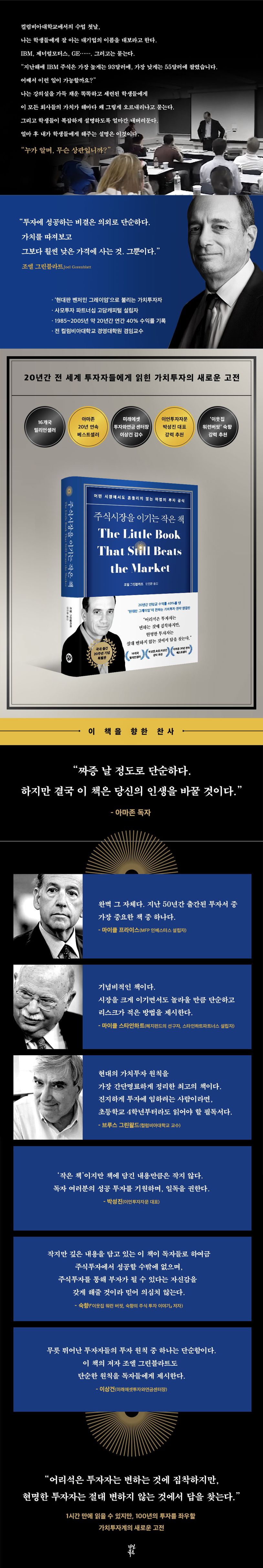 ★★★전세계100만부이상판매된밀리언셀러★★★★★★이언투자자문박성진,‘이웃집워런버핏’숙향,미래에셋투자와연금이상건추천★★★★★★아마존20년연속베스트셀러★★★“단두가지질문이면충분하다.좋은주식인가?그리고그주식은저렴한가?”1시간만에읽을수있지만100년의투자를좌우할가치투자계의새로운고전주식시장을보다보면혼란스럽기그지없다.단며칠만에똑같은기업의주가가30%폭락해있기도하고,1년중최저가와최고가의차이가두배이상일때도있다.한기업의내재가치가그렇게자주변하는것일까?당당히건재한몇몇분야의대표기업들조차이런일은비일비재한걸보면아마그건아닐것이다.그렇다면주가가이토록심하게오르내리는이유는대체무엇일까?주식투자의대가들은이이유를알고있을까?20년간연평균40%의경이로운수익률을낸실전투자자이자‘가치투자의산실’로불리는컬럼비아대학교에서오랫동안강의한투자대가조엘그린블라트는이런고민에딱잘라이렇게말한다.“누가알며,무슨상관이냐?”어쩌면사람들이제정신이아닐때가많아서일지도모르고,미래수익을예상하기가어려워서그런지도모른다.하지만주가가오르내리는이유는전혀알필요가없다.‘사람들이그렇게들한다’고만알면된다.그러면서그린블라트는‘좋은주식인가?’,‘그주식은저렴한가?’단두개의질문만던지면충분하다고주장한다.투자금대비얼마의수익을내는지를판단하는‘자본수익률’과주식에지불한가격대비얼마의수익을내는지를판단하는‘이익수익률’두가지의기준만있으면문제없다는것이다.그가제시하는마법공식은간단하다.자본수익률과이익수익률각각에대해높은순서대로기업들을정렬하고,두개의등수를더해점수를매긴다.예를들어자본수익률에서15등,이익수익률에서250등인기업이있다면이기업의점수는265점이고,자본수익률에서1등이지만이익수익률에서는602등인기업이있다면이기업의점수는603점이다.이렇게높은점수를받은순서대로정렬해상위20~30개기업의주식을매수하고각각을1년씩보유하면된다.마법공식은이렇게나간단하다!『주식시장을이기는작은책』의초판은2005년출간되었다.그리고개정판이나온시점인2010년까지무수한의문이제기되었다.‘저평가된줄알고샀는데그냥저가인주식이면어쩌나?’,‘그냥운이좋았던것아닌가?’,‘더매력적인경쟁사가등장해자본수익률이의미가없어진다면?’조엘그린블라트는2010년판개정판을펴내며다양한기간,다양한종목으로시험해본백테스트결과를제시해마법공식의효과는강력하다는사실을다시금증명했다.“한마디로완벽하다.지난50년간가장중요한투자책이다.”_마이클프라이스(MFP인베스터스창립자)물론그로부터또10년이넘게지난지금,이런의문도들것이다.‘케케묵은과거에나통했던공식아닐까?’이는2024년투자계를놀라게한버크셔해서웨이의실적으로답을대신할수있겠다.워런버핏이이끄는버크셔해서웨이는불확실한거시경제속에서도연간약68조원의수익을내며오히려전년도보다높은수익률을냈다.게다가이는적극적인주식투자자들,특히한국의주식투자자들이열광하는2차전지,전기자동차등빅테크기업에는일절투자하지않고서도올린성과였다.버핏은직접수익으로가치투자의힘이여전히건재함을보여주며투자자들에게깊은울림을주었다.실제로많은성공한주식투자자가그레이엄의시대로부터100년이지난지금도가치투자의원칙을통해수익을내고있다.대공황시기바겐세일하는주식들을주워담았던그레이엄의공식에현대성을부여한것이바로조엘그린블라트의마법공식이다.“지난50년간가장중요한투자책(마이클프라이스,MFP인베스터스창립자)”,“기념비적인책(마이클스타인하트,헤지펀드의선구자)”,“현대의가치투자원칙을가장간단명료하게정리한최고의책(브루스그린왈드,컬럼비아대학교교수)”등20년간이책에쏟아진화려한찬사들이책에신뢰성을더해준다.『주식시장을이기는작은책』2025년판은출간20주년을맞아번역의정확성을높이고미래에셋투자와연금이상건센터장의꼼꼼한감수로책의완성도를높였다.또한양장제본으로제작해오래도록‘바이블’처럼읽힐수있도록튼튼함과고급스러움을더했다.현명한주식대가들의책장에서단연맨위칸에꽂히는이책은국내주식투자자들에게도불확실한시장을헤쳐나갈혜안을선사할것이다.