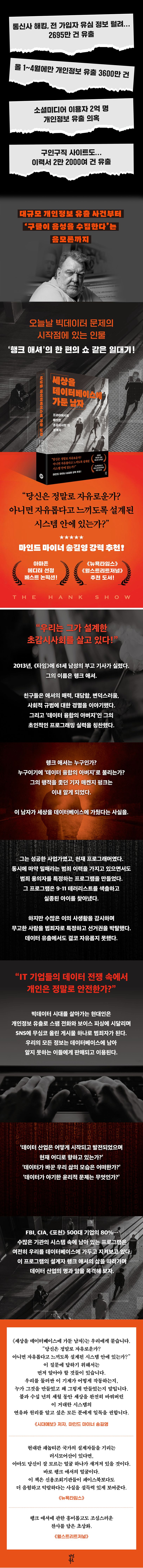 이 책은 빅데이터 시대의 시작점에서 ‘초감시사회’를 연 인물에 관한 이야기다. ‘행크 애셔’라는 이 인물은 사람들의 과거 기록을 분석해서 위험성을 파악하는 프로그램을 개발해 억만장자가 되었다. 이 프로그램은 수많은 범죄자와 실종된 아동을 찾아냈고, 9·11 테러 당시에는 테러리스트들을 특정해 FBI 등 정부 기관의 주목을 받았다. 동시에 특정한 의도를 가진 사람들의 손에 들어가 무고한 사람을 범죄자로 낙인찍고 선거권을 박탈해 선거 결과에 영향을 미치기도 했다. 그리고 이 프로그램은 지금까지도 FBI, CIA, 《포천》 500대 기업의 80퍼센트, 세계 10대 은행 중 7개 은행, 미국의 대략 1만 8000여 개의 법 집행기관의 시스템 속에 살아 있다.