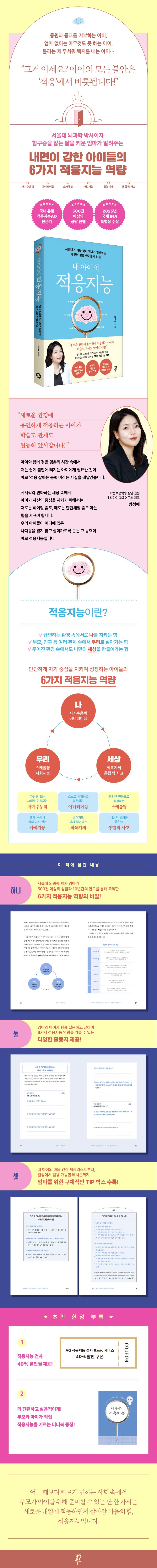 유독 내 아이만 뒤처진 것 같다면, 유독 내 아이만 불안해한다면, 유독 내 아이만 예민한 것 같다면 이 책 『내 아이의 적응지능』을 만나보라. 아이의 행동 뒤에 숨겨진 불안의 진짜 원인인 ‘적응’을 파악하고, 두려움 없이 당당하게 세상으로 나아갈 아이 내면의 힘을 키우는 방법을 모두 얻어갈 수 있을 것이다.