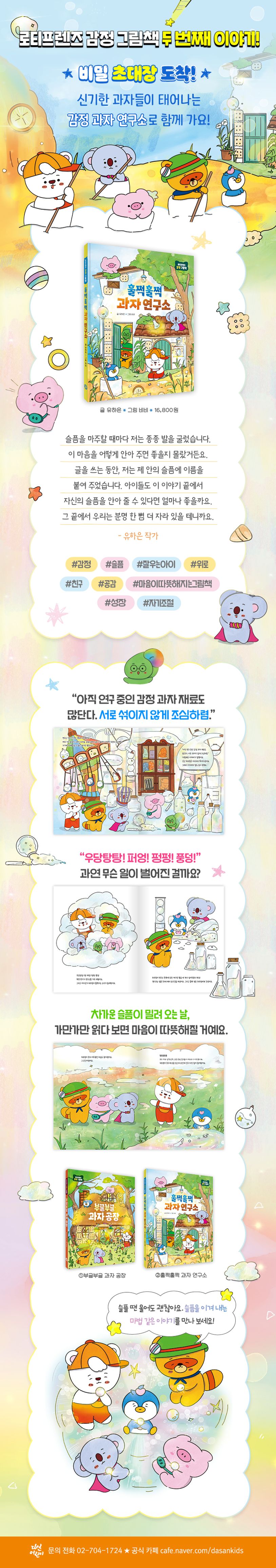 ★로티프렌즈의감정모험,두번째이야기!활발한로티,호기심많은캔디코,조심스러운베블리,의욕넘치는그리피,그리고엉뚱한하트핑!개성가득한로티프렌즈가다시한번아이들을감정의세계로안내합니다.우리는매순간감정을느끼며살아갑니다.그래서감정과맺는관계의질이곧삶의질을좌우합니다.아이가감정에휘둘리고압도되는사람이아니라,감정을이해하고받아들이며조절할수있는사람으로자란다면얼마나좋을까요?로티프렌즈감정그림책은바로그바람을담고있습니다.첫번째권《부글부글과자공장》이‘화’를다뤘다면,두번째권《훌쩍훌쩍과자연구소》는‘슬픔’을주제로한모험을담고있습니다.앞으로‘불안’,‘기쁨’,‘질투’등아이들이자주경험하는다양한감정들을다룰예정입니다.각권은마법의감정과자와함께감정을이해하고다루는과정을흥미로운이야기로풀어내어,아이들이자신의감정과건강하게마주할수있도록돕습니다.★비밀초대장이도착했어요로티프렌즈에게감정과자연구소로의비밀초대장이도착했어요!연구소에는아직완성되지않은과자재료들이가득합니다.그곳은미래에대한기대와복잡한경험과감정이뒤섞여있는우리의마음속과꼭닮았습니다.그런데재료들을구경하던하트핑이갑자기울기시작했어요.과연무슨일이벌어진걸까요?★슬퍼하는동안에도우리곁을지켜주는소중한사람들을기억해요아이들은슬플때웁니다.실컷울수있다는건오히려다행입니다.마음속어딘가가꽉막혀잘울지도못하는어른들이많으니까요.큰울음이든작은울음이든눈물은에너지를소모시키고분위기를무겁게하지만,한바탕울고나면감정이차분히가라앉기도합니다.그래서울음을나쁘게보지않고,수용하고기다려주는마음이아이를진정시킬수있습니다.슬픔은짐이아니라우리를단단하게만들어주는연습입니다.조개가눈물을모아진주를만들듯,아이의눈물도언젠가반짝이는힘이됩니다.《훌쩍훌쩍과자연구소》속하트핑의눈물이진주로변하는과정에는,아이들이슬픔을성장의씨앗으로삼기를바라는마음이담겨있습니다.우리아이가자신의슬픔을다루는법을배우는것도중요하지만,다른사람의슬픔을공감하고위로할줄아는마음을기르는것도소중합니다.이야기속에서하트핑을다정하게위로하는로티프렌즈의모습은,아이들에게자연스럽게‘위로하는방법’을가르쳐줄것입니다.슬픔의무게를견디고,그안에서작은기쁨과성장과공감의씨앗을찾아내는힘.《훌쩍훌쩍과자연구소》는바로그힘을아이와함께키울수있도록도와줍니다.*인증유형:공급자적합성확인