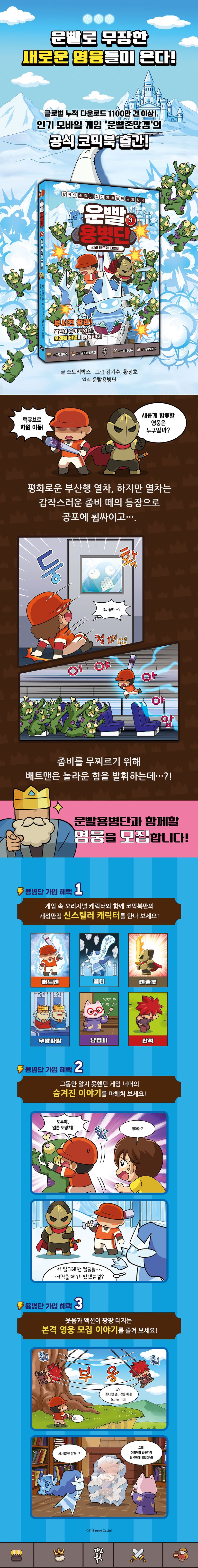 ‘운빨존많겜’ 세계관을 바탕으로, 게임 속 영웅들의 숨겨진 이야기와 비밀이 하나씩 밝혀지는 운빨용병단 코믹북! 배트맨은 운빨 왕국에 어떻게 적응했을까? 도도한 성격의 콜디가 순순히 운빨 왕국으로 온 데에는 다른 이유가 있지 않을까? 호기심 가득하고 박진감 넘치는 〈운빨용병단 3권: 검과 배트와 지팡이〉와 함께 게임만큼 즐거운 모험의 세계로 다시 한번 떠나 보세요!
