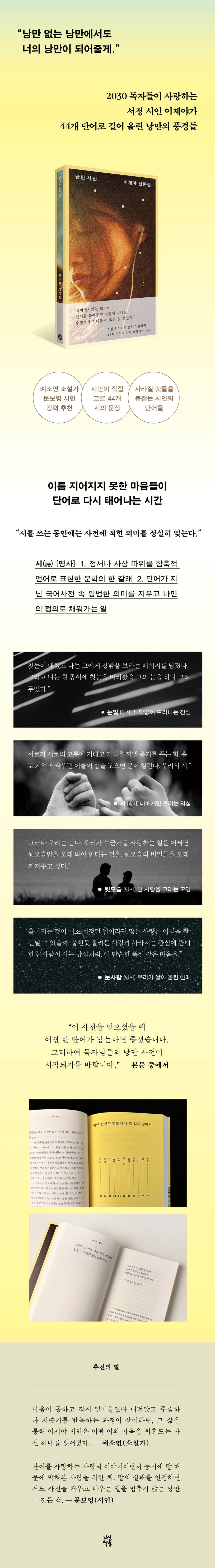 책을덮었을때,여러장의낙엽을한꺼번에밟는듯했습니다.그것은시인이여러겹의이야기를포개어들려주기때문일것입니다.이책은통상적인사전과반대로걷습니다.단어의본래뜻을지우고,비우는데서시작합니다.단어를아코디언에비유할수있다면,시인은주름을쫙펼쳐단어가살아온,그리고앞으로살아갈여러겹의생을보여줍니다.하나의단어에도전생과현생,다음생이있는것처럼요.이책은단어를사랑하는사람의이야기이면서,말때문에막혀본사람을위한책입니다.언어가끝내해내지못하는일이있음을받아들이면서도,하지못한말들이언젠가시가될것임을믿습니다.말의실패를인정하면서도사전을채우고비우는일을멈추지않는것,그것이이책이말하는‘낭만’일것입니다.