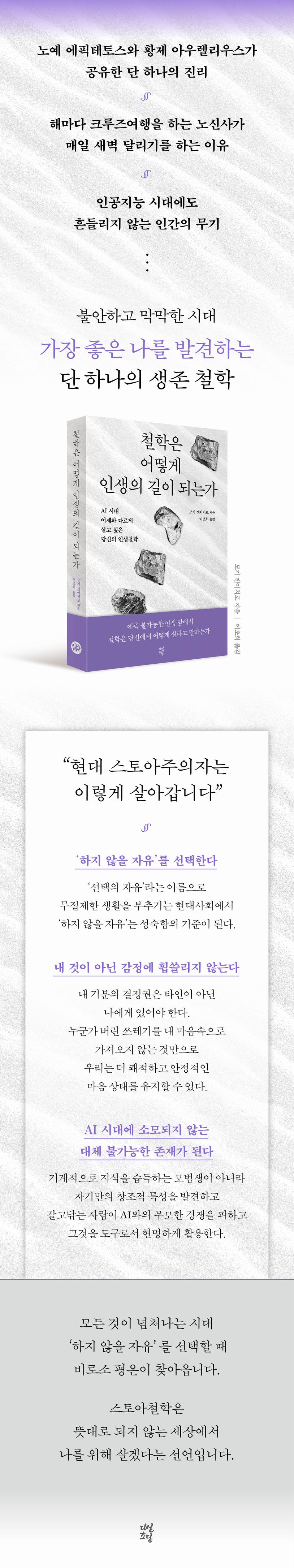 정보는 넘쳐나고 선택지는 끝없이 늘어나는 이 시대, 우리는 역설적으로 더 공허하고 더 불안하다. 『철학은 어떻게 인생의 길이 되는가』는 AI 시대를 살아가는 현대인을 위해 스토아철학의 정수를 뇌과학적 시선으로 풀어낸 책이다. ‘하지 않을 자유’를 선택하는 것, 통제할 수 없는 것에 감정을 낭비하지 않는 것, 일상의 세밀한 결에서 삶의 의미를 찾는 것 등. 이 책은 소란스러운 세상 속에서 자기만의 중심을 세우는 법을 가장 철학적이고 가장 과학적인 언어로 안내한다.