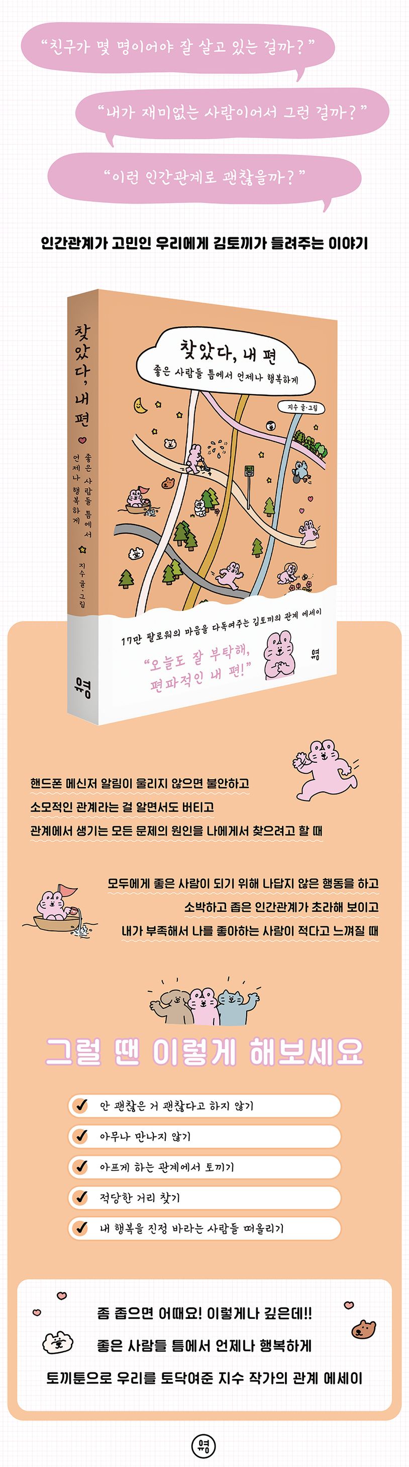 《찾았다, 내 편》은 이처럼 누구도 자유로울 수 없는 인간관계 문제를 다룬 책이다. 여기 등장하는 김토끼는 인스타그램에서 17만 팔로워의 사랑을 받고 있는 지수 작가의 귀여운 분홍 토끼다. 김토끼는 《찾았다, 내 편》에서 관계를 맺으며 누구나 한 번씩 겪는 에피소드로 공감을 불러일으키고 ‘복잡할수록 단순하게, 좋은 건 좁고 깊게!’를 외치며 관계 고민에 대한 처방전을 내려준다. 독자들은 이 책을 통해 복잡다단한 관계 문제를 하나씩 정리해 진정 내 행복을 바라는 ‘내 편’을 찾을 수 있을 것이다.