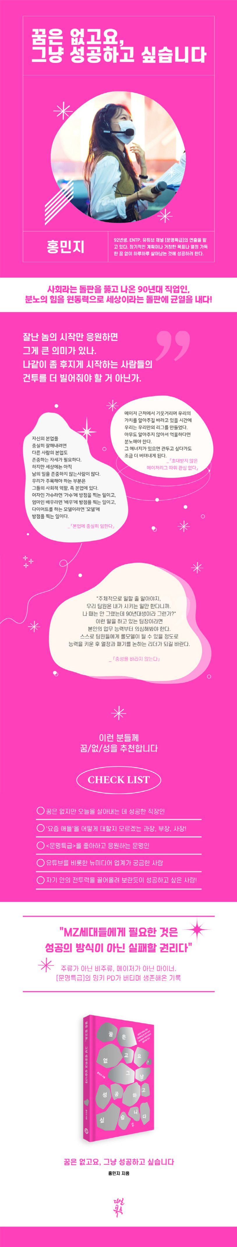 치열한 입시 경쟁과 험난한 취업난을 뚫고 사회에 나온 90년대생 중 한 명인 홍민지 PD는 이 책을 통해 동년배들에게 각자 선 자리에서 자기만의 성공 방식을 써 내려가 달라는 메시지와 힘찬 응원을 보낸다. 90년대생이 꼭 아니더라도, 정답을 알려주지 않는 사회 속에서 밑천도 근본도 없이 온몸으로 부딪히며 독자적인 문법으로 자신만의 길을 만들어가고자 하는 사람들이라면 이 책을 읽으며 마음속의 울림을 느낄 것이다. 절대 깨지지 않을 것 같은 돌판에 실금이라도 내보고자 오늘도 꾸준히 돌직구를 던지며 치열하게 버티고 있는 이들에게 『꿈은 없고요, 그냥 성공하고 싶습니다』를 소개한다.