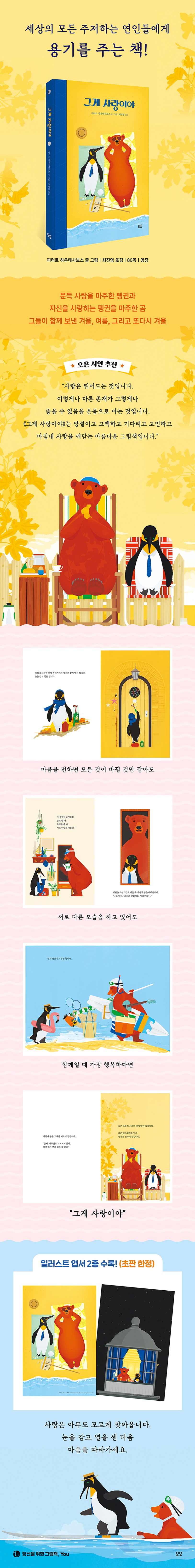 작가 피터르 하우데사보스에게 어느 날, 사랑이 무엇인지 딸이 물어왔다. 한참을 고민한 후에 나온 대답은 《그게 사랑이야》 집필로 이어졌다. 작가는 따뜻하고 화려한 색채와 디테일 가득한 그림으로 외로움, 행복, 사랑의 감정을 다채롭게 보여준다. 예고 없이 찾아온 사랑 앞에서 생김새도, 사는 곳도, 좋아하는 것도 모두 달라 주저하는 순간들이 있다. 그럼에도 용기 내 마음을 고백하는 펭귄과 곰의 솔직한 모습은 많은 이유로 망설이는 우리에게 용기를 준다. 함께일 때 가장 행복한 “그게 사랑이야.”라고 말하면서.