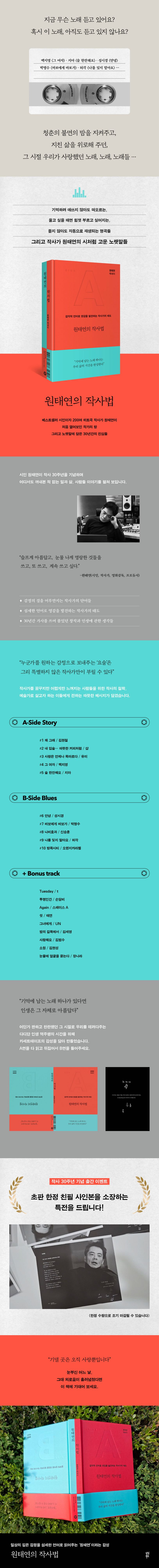 그만큼 그의 예술과 인생은 떼려야 뗄 수 없는 관계다. 원태연 작가의 시와 가사는 모두 그의 인생에서 나온 것이며 그는 모든 작품에 진심을 담기까지 실수와 후회, 반성과 깨달음을 반복하며 사람과 세상에 대한 이해와 사랑을 키워왔다. 원태연의 작품이 언제나 우리 가까이에서 섬세하게 감정을 살펴줄 수 있었던 그 이유, 그의 사람 냄새 나는 유쾌하고도 진중한 면모가 이 책 『원태연의 작사법』에서 30년 만에 처음으로 드러난다.