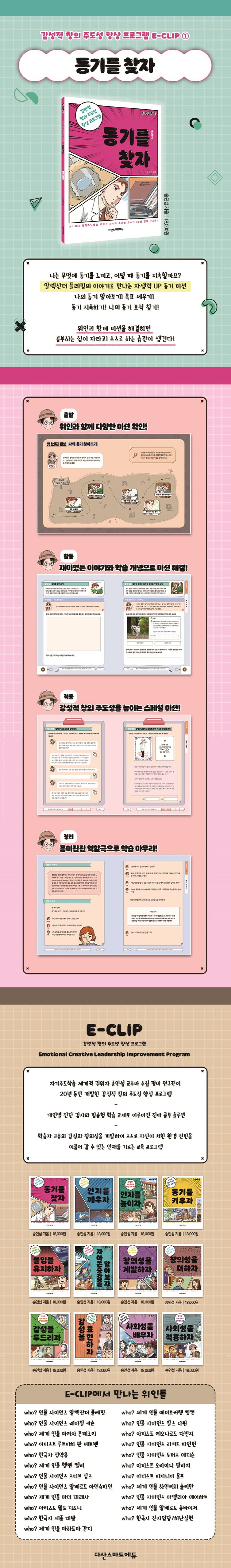 코로나가 진정되고 정상 등교를 시작하자, 아이들의 학습 격차는 극명하게 나뉘었습니다. 그 이유는 무엇일까요? 무엇을 하고 싶은지, 왜 학습해야 하는지를 아는 아이들은 스스로 공부하는 습관이 있어 자유로운 환경 속에서 쑥쑥 성장했지만, 학습 동기가 없는 아이들은 통제가 없는 환경에서는 아무것도 하지 않았기 때문입니다. 학습 격차를 줄이고 학습을 심화할 수 있는 진짜 솔루션이 바로 ‘E-CLIP’입니다. 위인과 함께 미션을 풀어나가는 열두 권의 교재와 함께라면 감성적 창의성을 높이고, 스스로 학습할 줄 아는 아이로 성장할 것입니다.