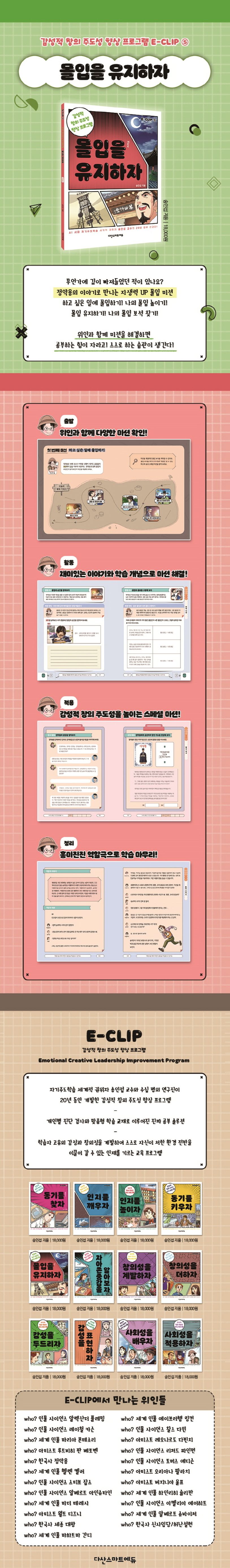 코로나가 진정되고 정상 등교를 시작하자, 아이들의 학습 격차는 극명하게 나뉘었습니다. 그 이유는 무엇일까요? 무엇을 하고 싶은지, 왜 학습해야 하는지를 아는 아이들은 스스로 공부하는 습관이 있어 자유로운 환경 속에서 쑥쑥 성장했지만, 학습 동기가 없는 아이들은 통제가 없는 환경에서는 아무것도 하지 않았기 때문입니다. 학습 격차를 줄이고 학습을 심화할 수 있는 진짜 솔루션이 바로 ‘E-CLIP’입니다. 위인과 함께 미션을 풀어나가는 열두 권의 교재와 함께라면 감성적 창의성을 높이고, 스스로 학습할 줄 아는 아이로 성장할 것입니다.