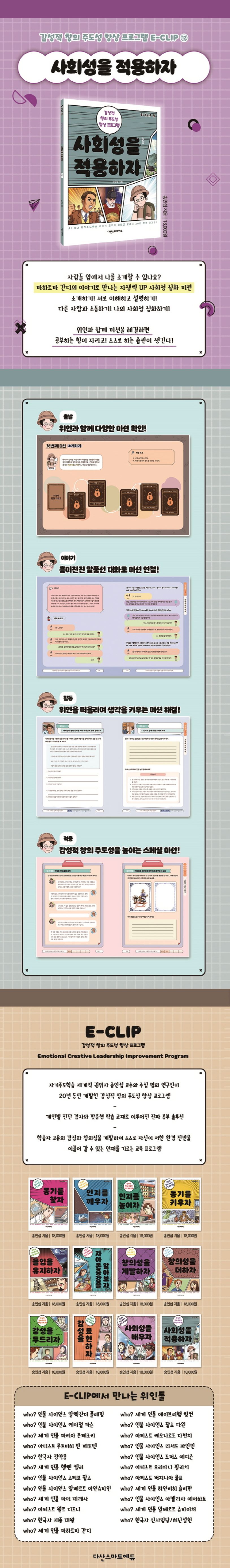 코로나가 진정되고 정상 등교를 시작하자, 아이들의 학습 격차는 극명하게 나뉘었습니다. 그 이유는 무엇일까요? 무엇을 하고 싶은지, 왜 학습해야 하는지를 아는 아이들은 스스로 공부하는 습관이 있어 자유로운 환경 속에서 쑥쑥 성장했지만, 학습 동기가 없는 아이들은 통제가 없는 환경에서는 아무것도 하지 않았기 때문입니다. 학습 격차를 줄이고 학습을 심화할 수 있는 진짜 솔루션이 바로 ‘E-CLIP’입니다. 위인과 함께 미션을 풀어나가는 열두 권의 교재와 함께라면 감성적 창의성을 높이고, 스스로 학습할 줄 아는 아이로 성장할 것입니다.