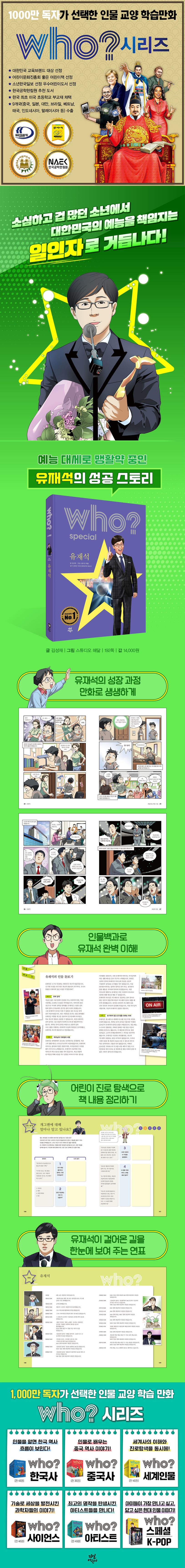 책 속 부록인 ‘인물 백과’ 코너에서는 국민 MC로 거듭난 유재석의 노력에 대해 자세히 알아봅니다. 그리고 한국 방송의 역사와 방송 콘텐츠, 그와 관련된 직업 등을 배울 수 있습니다.