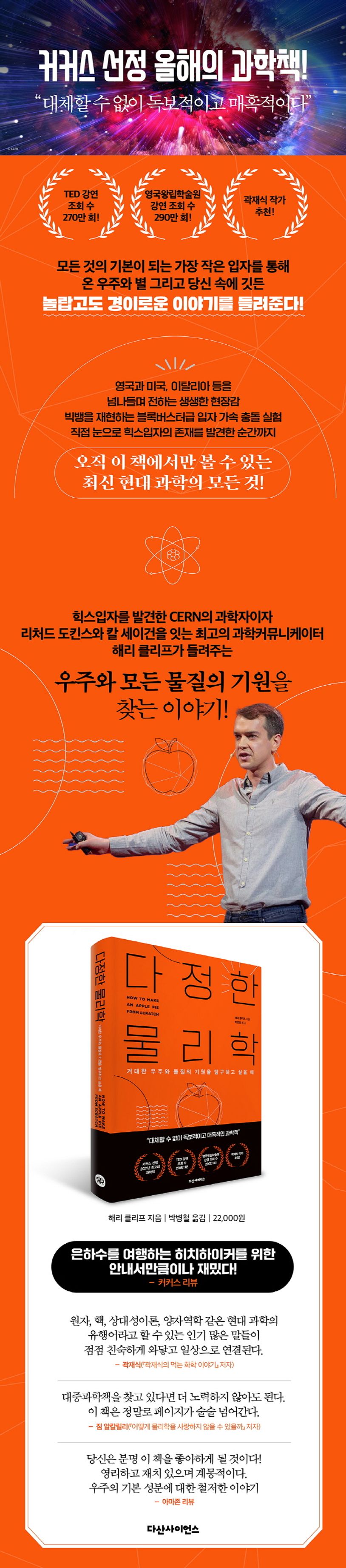 이 책은 실험물리학자가 쓴 몇 안 되는 과학교양서로 우리 세계의 신비가 밝혀지는 순간이 그 어떤 과학책보다 현실감 있게 담겨 있다. 수식과 개념의 난립이 아닌, 불과 연기, 거대한 엔진이 돌아가는 이야기를 통해 당신은 이 세상이 가진 경이를 목격할 수 있을 것이다.