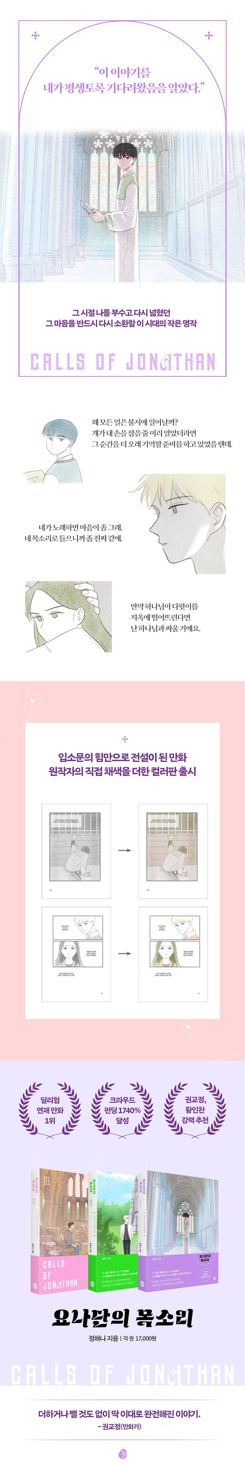 독립연재 플랫폼 딜리헙에서 거친 스케치처럼 다가오는 작화로 연재되기 시작한 『요나단의 목소리』가 자극적인 소재 하나 없이 크라우드 펀딩 대박에까지 이른 것은 오로지 입소문의 힘이었다. ‘후유증을 남기는 만화’이자 ‘갓작’으로 널리 회자되었으며 단행본 출간 문의가 빗발쳤던 이 작품이, 원작자에 의한 수채화 채색을 입고 한층 깊어진 감성으로 독자들을 다시 만난다.