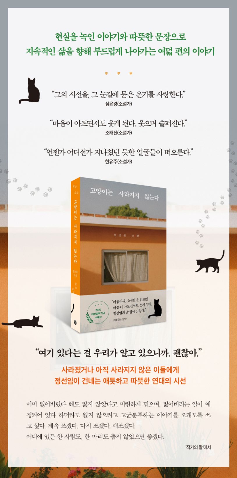 “현실과 진지하게 대면하는 이야기의 맛이 생생하다”는 평으로 2018년 중앙신인문학상을 받으며 등단한 작가 정선임의 첫 소설집. 『고양이는 사라지지 않는다』는 삶이라는, 실패와 상실이 빈번하게 펼쳐지는 그 세계에서 자신의 존재를 찾으려 애쓰는 인물들을 따뜻한 슬픔의 모양으로 그려낸다. 작가의 말에서 “소설가는 오래오래 생각하고, 뒤돌아보고, 기억하고, 슬퍼하는 사람”이라고 생각한다고 밝힌 것처럼 인물들이 겪는 아픔과 고통을 꿋꿋하게 바라본다. 다양한 빛깔의 세월이 응축되어 있는 각각의 삶이 섬세한 문장을 통해 부드럽게 풀어진다.