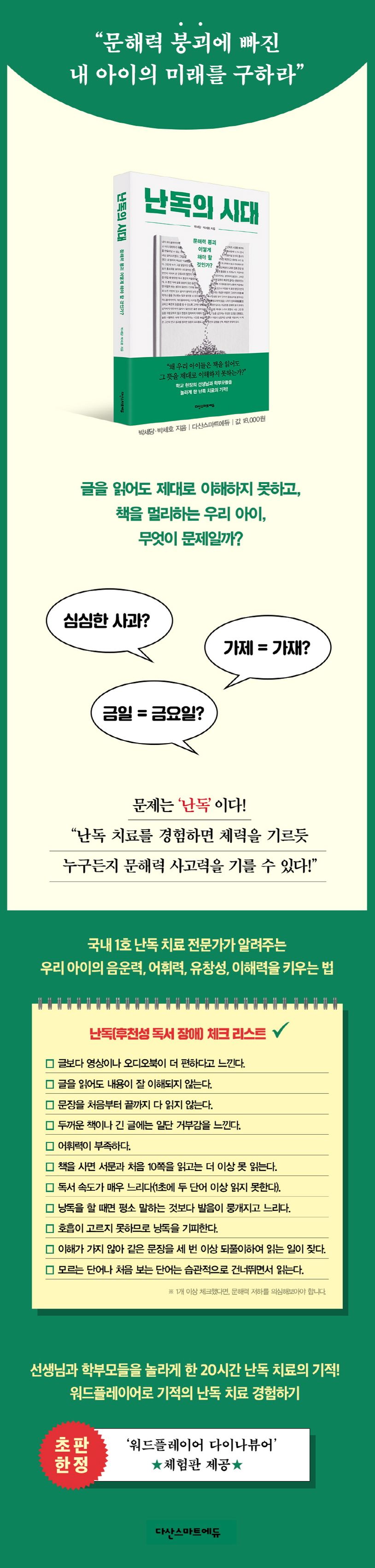 난독 현상이 쌓여 우리 사회에 드디어 글을 읽지 못하고 이해하지 못하는 현상이 넓고 깊어져서 더는 덮고 넘어갈 수 없는 가시적 현상이 됐다. 코로나19 사태로 급진전된 것일 뿐, 오래전부터 층층이 쌓여온 문제다. 이에 교육 현장에서도 큰일 났다는 위기의식이 확산되고 있다. 대한민국 1호 난독 전문가 박세당 저자는 디지털 기기로 인한 후천성 독서 장애 문제를 공론화하고 이를 해결할 방법을 제시하고 있으며, 공동 저자 박세호는 인지 뇌과학 측면에서 뇌가 글을 인지하고 이를 학습하는 과정을 집중적으로 연구했다. 지금 문해력 붕괴의 핵심 원인은 디지털 기기에 의한 독서 장애로, 독자들은 본 책을 통해 ‘난독’이라고 불리는 후천성 독서 장애 현상이 무엇인지 깊이 이해하고, 무엇이 문제가 되어 우리와 우리 자녀가 책을 못 읽고 책을 멀리하게 되었는지와 독서 장애를 어떻게 판단하고 어떻게 고칠 수 있는지에 대해서도 과학적 근거를 바탕으로 확신하게 될 것이다.
