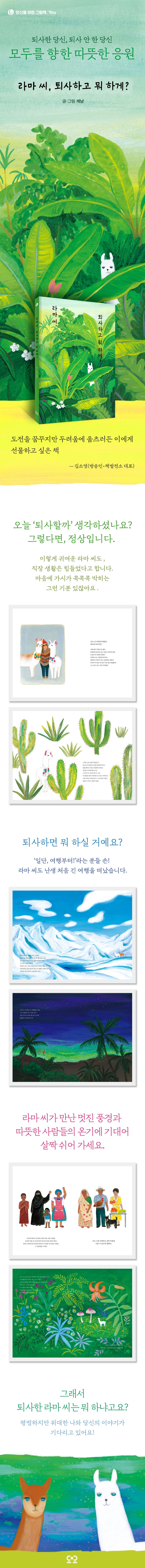 많은 여행자의 로망인 페루. 페루에서도 최근 마추픽추보다 더 인기 있다는 무지개산. 책의 주인공 라마는 이 무지개산에서 관광객들과 함께 사진을 찍는 일을 하는 평범한 직장 생물이었다. 그런데 이렇게 아름다운 곳에서도 직장생활은 힘든 일이었다. 어느 날 라마는 드디어 사표를 내고 여행을 떠난다. 여행길에서 평소 동경하던 자유의 영혼 ‘비쿠냐’를 만난다. 책에는 라마와 비쿠냐가 함께한 여행의 아름다운 풍경과 위안을 주는 대화가 가득하다. 그래서 퇴사한 라마는 무엇이 되었을까? 꿈과 자기 자신을 찾아가는 라마 혹은 우리의 아름다운 여정을 만나보자.